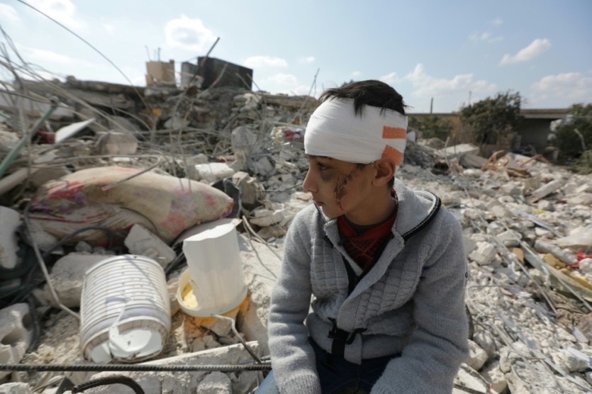 Un jeune garçon blessé, qui a perdu sa famille dans le séisme, assis au milieu des décombres, le 11 février 2023 à Jandairis, en Syrie Bakr ALKASEM [AFP]