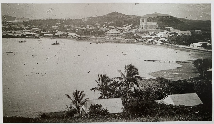 Baie de la Moselle circa 1912. La rue lingeant la mer a l’époque, avant les grands chantiers de remblai, est la rue Sébastopol.Depuis la fin du XIXème siècle, une politique de grands travaux de remblayage est menée. Petit à petit, Nouméa se construit en gagnant sur la mer. De 1931 à 1936, l'aménagement de la baie de la Moselle se développe pour pallier un chômage important dû à la crise des années 30, qui touche notamment les employés du Nickel. La terre de remblai est alors apportée des collines de l'Artillerie et du Mont-Coffyn. Mais ce chantier, véritable travail de forçat accompli par des " libres ", suscite à l'époque, selon la tradition orale, bien des mécontentements et une vague de ressentiment à l'égard des travailleurs étrangers. En l'absence de syndicats pour les défendre, les ouvriers du Nickel se retrouvent sans emploi et occupés donc à " taper dans la butte " tandis que les engagés javanais, tonkinois..., " protégés " par leur contrat d'engagement, conservent leurs emplois, très mal rémunérés certes, mais des emplois tout de même !