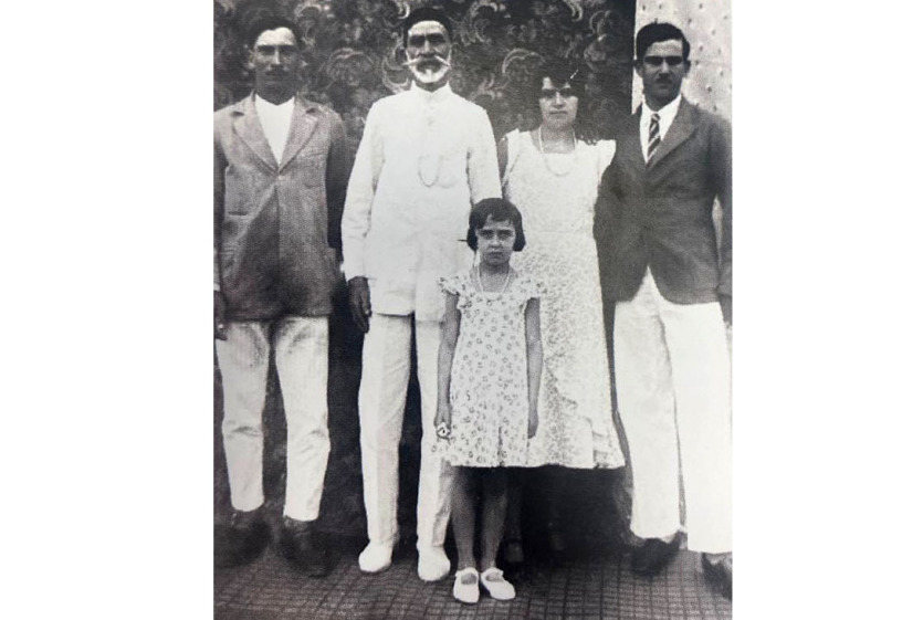 " L’homme aux belles moustaches, au milieu, c’est mon grand-père maternel, Taïeb ben Mabrouk. L’administration a transformé son prénom en nom de famille. C’était un transporté, lui aussi, mais il n’avait rien fait ! C’est son frère qui avait commis une bêtise en Algérie, mais comme ce frère avait une femme et des enfants, la famille a décidé que ce serait lui qui irait au bagne à sa place. Le pauvre a regretté toute sa vie, c’était vraiment terrible comme décision. À gauche, mon père, Ahmed. La petite, c’est la dernière fille de Taïeb, " Tita ". À droite, ce sont les époux Boighi. "