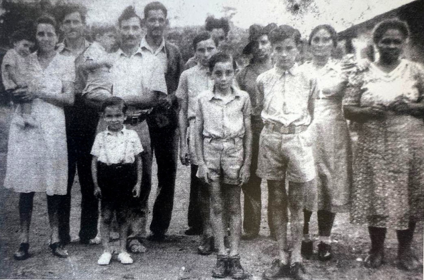 " Voici ma grande famille, avec quelques amis au dernier plan. À gauche, ma mère Zora me tient dans ses bras. Mon père Ahmed porte mon grand frère Belkacem. Ma grand-mère, Marie-Claire Moureau (2° en partant de la droite), est à côté de Mme Boussenah. " Photo DRLa tragédie de Témala