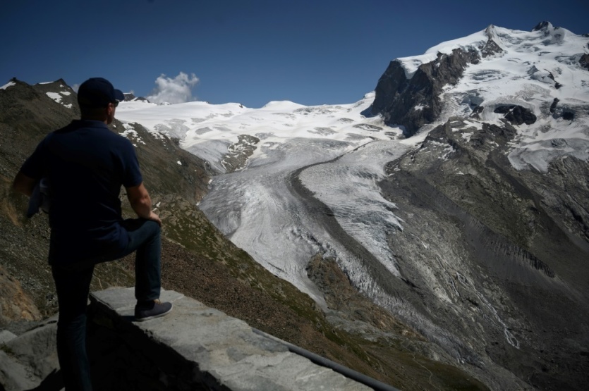 Un touriste regarde le glacier du Gorner en train de fondre, à 3089 mètres d'altitude au-dessus de la station de Zermatt, en Suisse, le 8 août 2020 Fabrice COFFRINI [AFP/Archives]