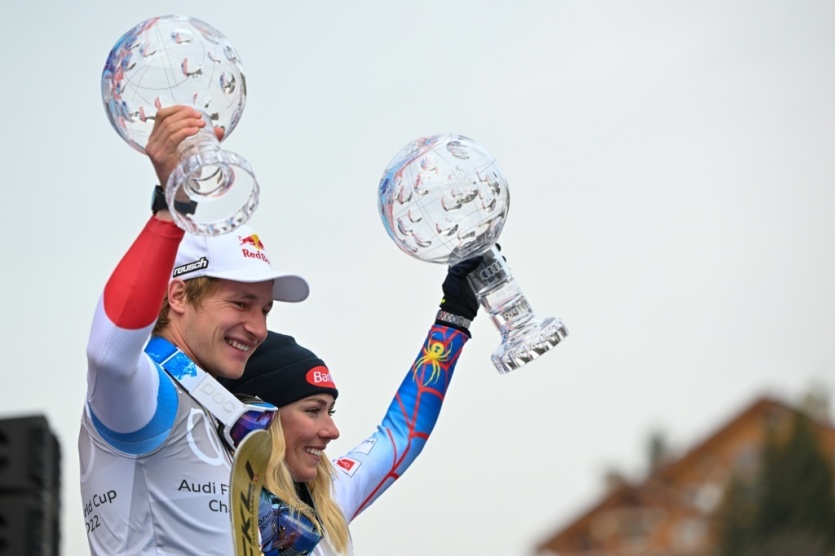 Le Suisse Marco Odermatt (G) et l'Américaine Mikaela Shiffrin brandissent le globe de cristal sur le podium lors des finales de la Coupe du monde de ski alpin FIS 2021/2022 à Méribel, dans les Alpes françaises, le 20 mars 2022 SEBASTIEN BOZON [AFP/Archives]MERCI DE VOUS IDENTIFIER
