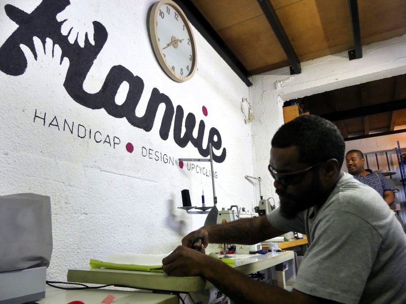 Qu’importent les va-et-vient des visiteurs du jour, Wilfried est imperturbable quand il s’agit de poser les fermetures éclair des trousses en bâches recyclées qu’il est en train de confectionner. Malvoyant, le jeune homme travaille depuis trois semaines dans l’atelier d’Hanvie, rue Félix-Broche, à Magenta. "Je suis en période d’essai pour un mois."
