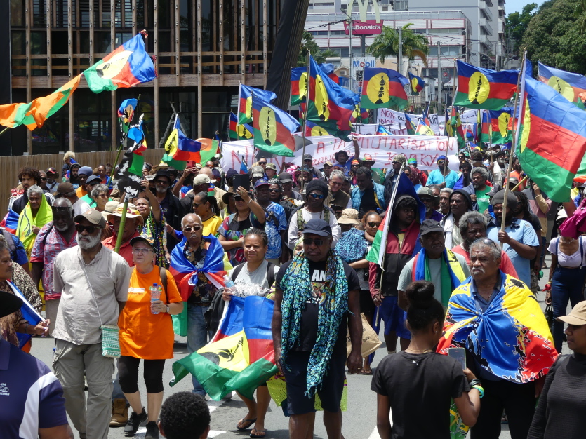 Le mot d’ordre était clair : se faire voir et entendre, si possible jusqu’au haut-commissariat, où le ministre de l’Intérieur et des Outre-mer échangeait avec les délégations indépendantistes et non-indépendantistes. Plus de 900 personnes, selon la police, se sont rassemblées vendredi matin, place de la Moselle, avant d’entamer une marche à 10h30 en direction de la place de la Paix puis du haut-commissariat, "pour aller dire à Darmanin qu’ici, c’est Kanaky", lâchait le speaker perché sur un camion en tête de cortège.