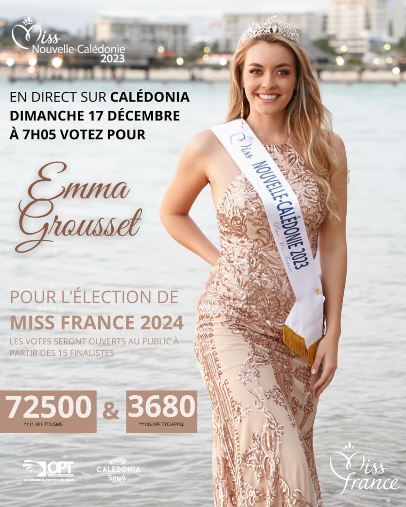 Emma Grousset a besoin de vous. Vous pourrez la soutenir lors de l'élection de Miss France 2024 qui sera retransmise sur Caledonia ce dimanche 17 décembre à partir 7h05 uniquement si Emma est sélectionnée parmi les 15 finalistes. Dès lors, un numéro entre 1 et 15 lui sera attribué et c'est ce numéro qu'il faudra envoyer par SMS au 72500 (111 francs le SMS) ou par téléphone en appelant le 3680 (105 francs l'appel).