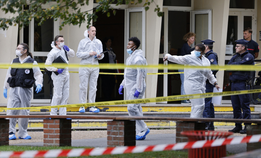 Des policiers français du service médico-légal se tiennent devant le lycée Gambetta à Arras, dans le nord-est de la France, le 13 octobre 2023, après qu’un enseignant a été tué et deux autres personnes grièvement blessées lors d’une attaque au couteau, ont déclaré la police et les responsables régionaux. – L’auteur a été arrêté par la police, a écrit le ministre de l’Intérieur Gérald Darmanin sur X, anciennement Twitter. Photo Ludovic MARIN / AFPAvant de tuer, l’assaillant, né en Russie, a revendiqué son geste dans une vidéo au nom de l’organisation Etat islamique (EI). La France est placée en alerte "urgence attentat".