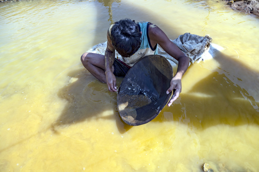Assis dans des flaques d’eau boueuse, des dizaines de jeunes font tourner avec dextérité de grandes "assiettes" creuses, cherchant parmi la terre des morceaux d’or qui auraient adhéré au mercure, polluant pourtant interdit.
