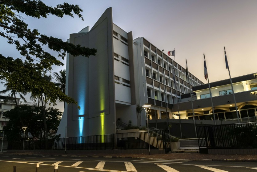 Accueil > Solidarité > Grand Nouméa > Nouméa > La façade de l'hôtel de ville aux couleurs de l'Ukraine
