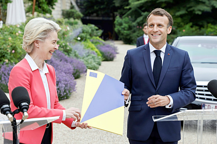 "Je suis heureuse d'annoncer que la Commission soutient le plan de relance français", a déclaré tout sourire Ursula von der Leyen depuis les jardins de l'Elysée, en brandissant avec Emmanuel Macron le dossier d'approbation du plan français.
