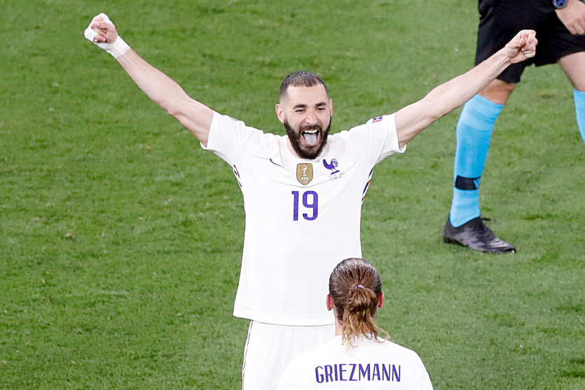 - AFP avec A.F. | Crée le 24.06.2021 à 08h00 | Mis à jour le 24.06.2021 à 12h42ImprimerKarim Benzema a retrouvé le chemin des filets avec l’équipe de France, ses premiers buts avec les Bleus depuis plus de cinq ans et huit mois. Photo AFPLes Bleus ont difficilement terminé en tête du groupe F face au champion en titre portugais (2-2), jeudi matin à Budapest après un duel étouffant entre l’inoxydable et recordman Cristiano Ronaldo et le revenant Karim Benzema, au compteur enfin débloqué avant les 8es de finale de l’Euro, où la France affrontera la Suisse.