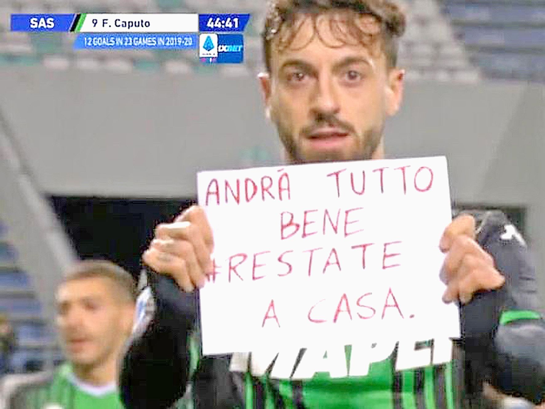 - FOOTBALL. « Andra tutto bene, Restate a casa » : Francesco Caputo, attaquant de l’équipe de Sassuolo, avait tout compris avant beaucoup de ses compatriotes. Son message rassurant, brandi après un but marqué début mars, est aujourd’hui devenu le mot d’ordre de l’Italie, un pays plus que jamais confiné pour lutter contre l’avancée du coronavirus.C’était le 9 mars et en Europe on jouait encore au foot. Mais l’Italie était déjà inquiète, la maladie faisait déjà beaucoup de dégâts et les mesures de restriction des déplacements étaient sur le point d’être durcies. Ce soir-là, Sassuolo a battu Brescia 3-0 dans ce qui resteIl vous reste 94% de l'article à découvrir.Cet article est réservé aux abonnés.
