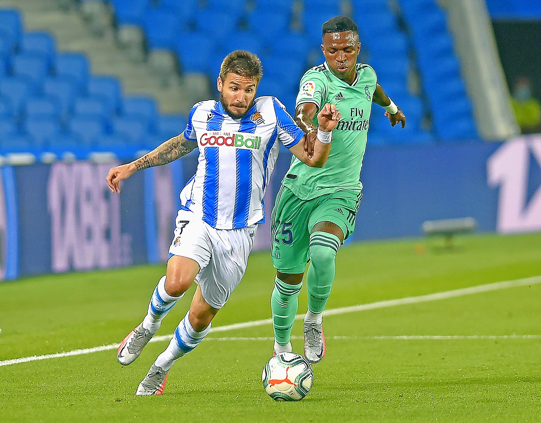 - FootballLe Real Madrid est repassé à la 1re place du championnat d’Espagne en l’emportant 2-1 hier chez la Real Sociedad en clôture de la 30e journée. Vinicius (50e, à droite sur la photo) et Karim Benzema (70e) ont marqué pour l’équipe entraînée par Zidane, qui devra faire sans son déIl vous reste 43% de l'article à découvrir.Cet article est réservé aux abonnés.
