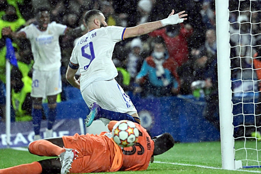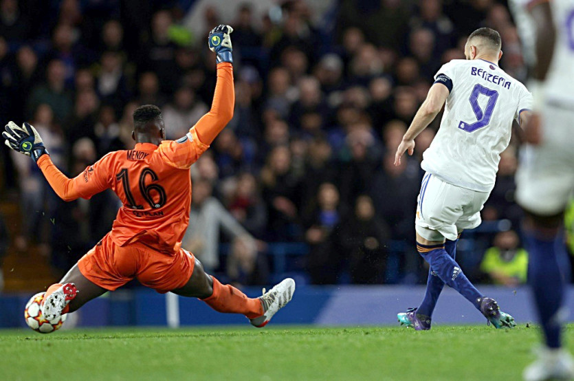L'attaquant français Karim Benzema marque son 3e but face au gardien sénégalais de Chelsea, Edouard Mendy, lors du quart de finale aller de la Ligue des Champions, le 6 avril 2022 au Stade de Stamford Bridge