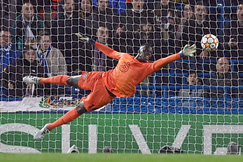 Le gardien de but sénégalais de Chelsea Edouard Mendy encaisse le 2e but sur une tête de l'attaquant français du Real Madrid Karim Benzema, lors du quart de finale aller de la Ligue des Champions, le 6 avril 2022 au Stade de Stamford Bridge