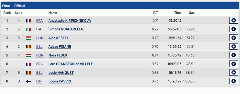 Pas de médaille pour Lara Grangeon de Villèle, hier, sur le 1500 m nage libre. La Calédonienne termine à la sixième place de la finale avec un temps de 16'09''03, à près de 50 secondes de la gagnante française Anastasiia Kirpichnikova (15'20''12).