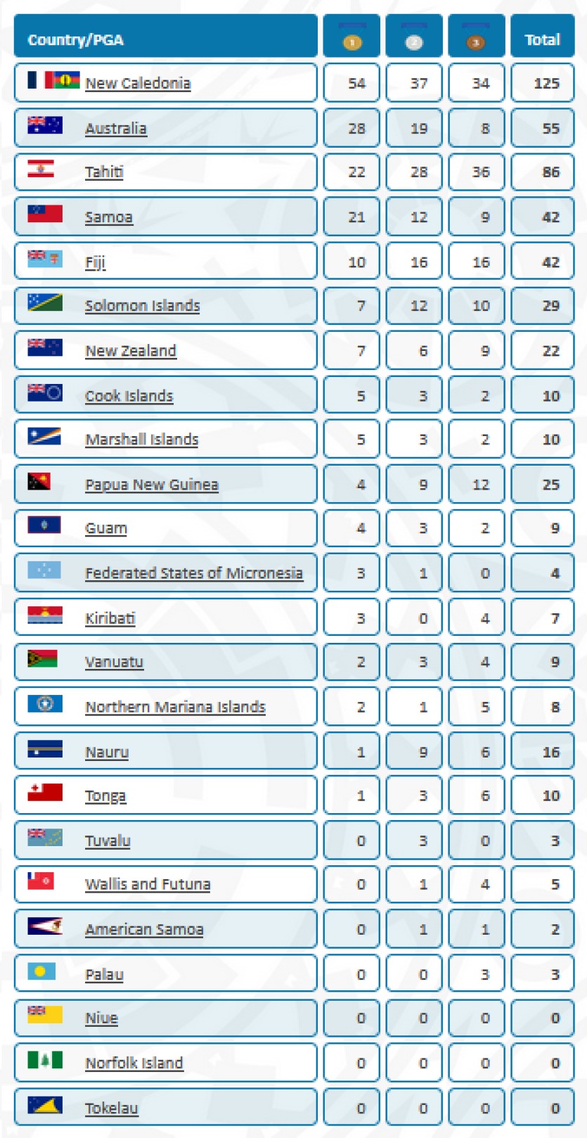 Le tableau des médailles à l’issue de la première semaine de compétitions. Illustration Jeux du pacifiqueDans cette dernière discipline, les joueurs du Caillou ont poursuivi leur suprématie avec des victoires en équipe chez les femmes et chez les hommes, et l’or en individuel pour Guillaume Castagne. Le joueur de La Ouenghi est accompagné sur le podium par un autre golfeur de Boulouparis, Hugo Denis, qui décroche finalement une médaille de bronze.