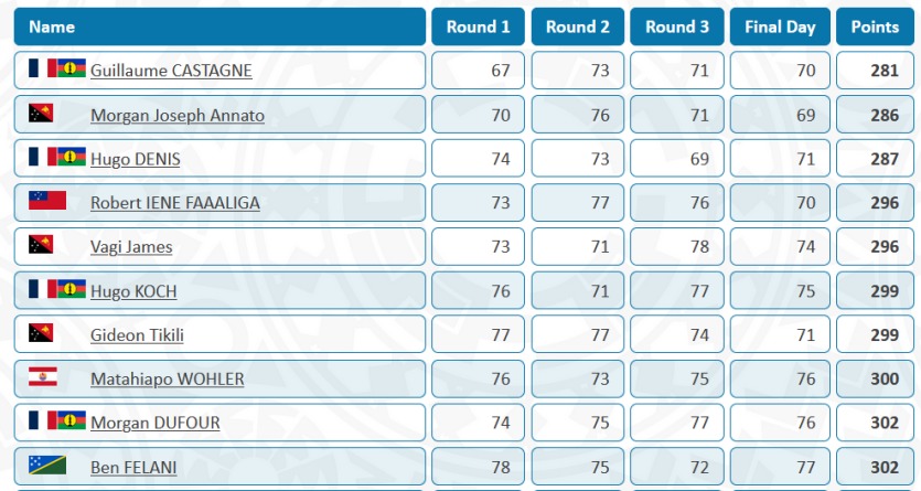 Côté féminin, les Cagoues sont montées sur la plus haute marche du podium grâce à une très belle dernière journée. Avec des scores de 70 pour Priscilla Gracia Lormand, de 73 pour Mohea Mansbendel et de 76 pour Lola Alibaud (le quatrième résultat, celui de Eden Ho avec 79, ne compte pas dans le décompte par équipe), les joueuses calédoniennes ont terminé en trombe le tournoi. Elles devancent au final la Papouasie-Nouvelle-Guinée de 7 longueurs et les Samoa américaines de 22 coups. Au classement individuel, grâce à son très bon dernier tour Priscilla Gracia Lormand (301) passe devant la Polynésienne Kirra St-Laurent (306) pour l’argent, mais reste loin derrière l’intouchable tongienne Alexis J.G.M. Vakasiuola (291).