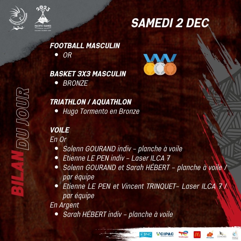Illustration CTOSEn or pour les hommes de la sélection calédonienne de football, mais aussi pour Solenn Gourand en individuel en planche à voile et par équipe avec Sarah Hébert (elle décroche l’argent en individuel), et également pour Étienne Le Pen en individuel en Laser et par équipe avec Vincent Trinquet.
