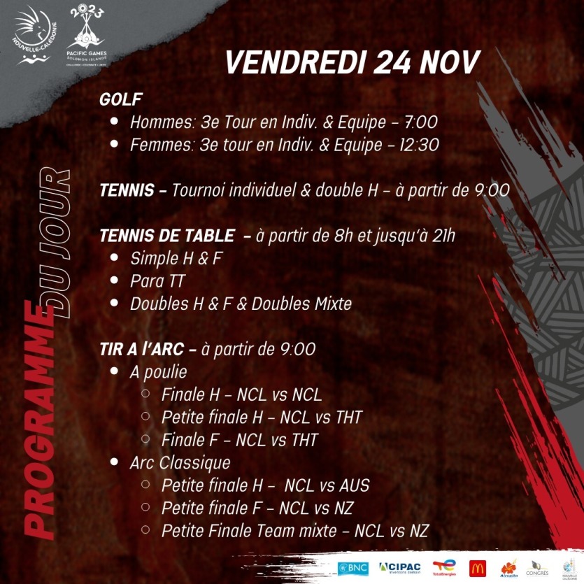 - | Crée le 24.11.2023 à 07h44 | Mis à jour le 24.11.2023 à 07h51ImprimerLe tennis de table est au programme de cette cinquième journée des Jeux. Photo CTOSCinquième journée des Jeux du Pacifique avec de nouveau de la natation et du tennis de table au programme. Mais aussi du golf, de la planche à voile, du tir à l’arc et de l’haltérophilie.