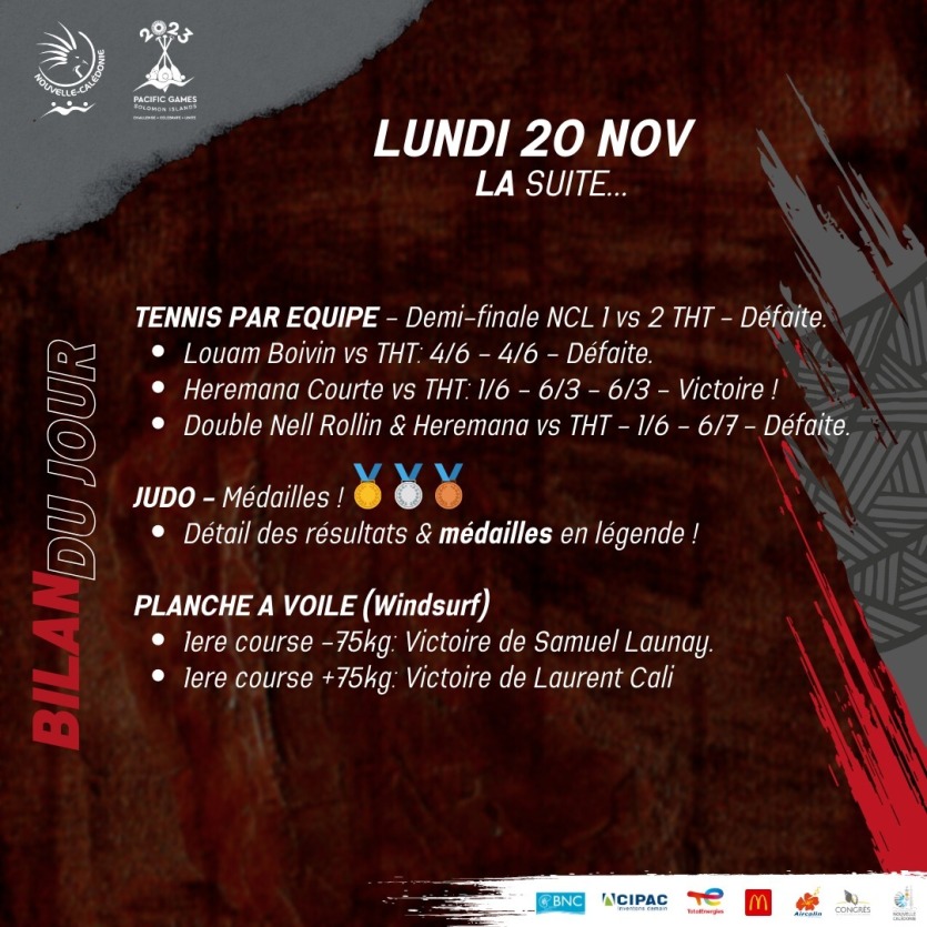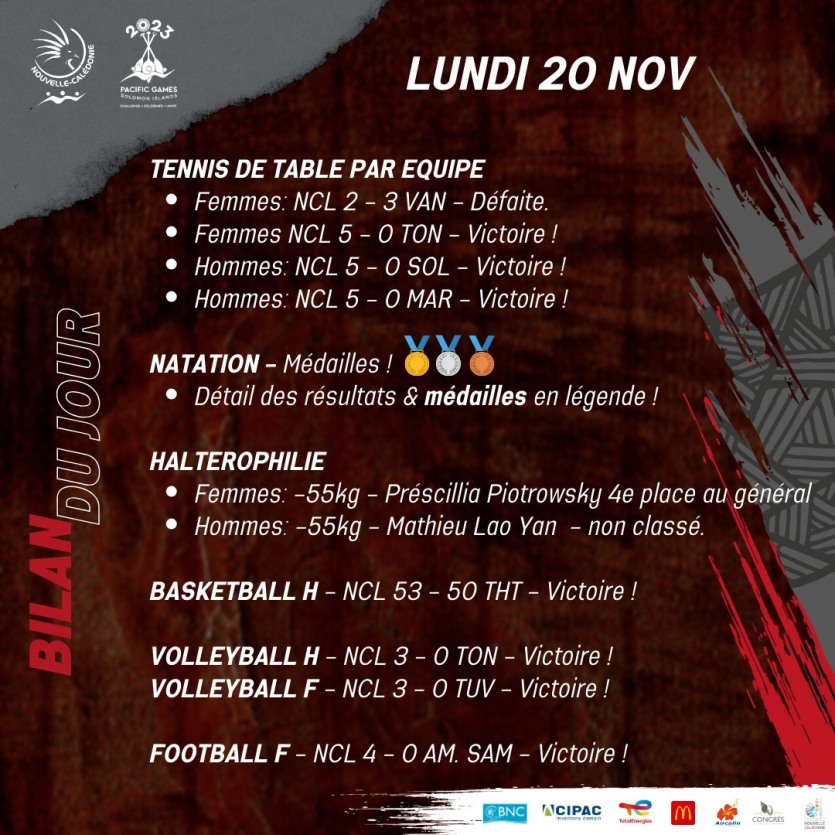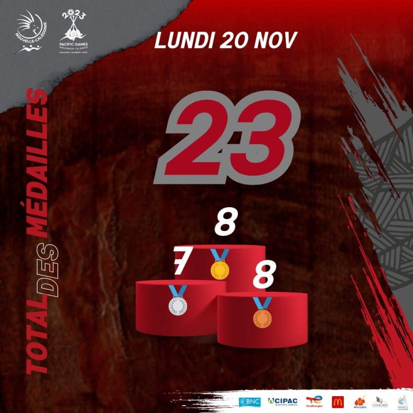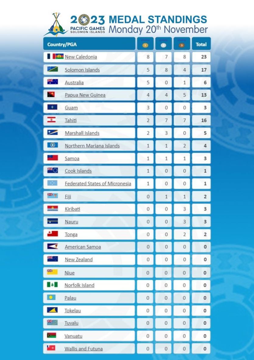 Le tableau des médailles des XVIIes Jeux du Pacifique à l’issue de la première journée officielle de compétition, lundi.A noter que Marine EROUT en 400 nage libre, Loann CAYUELA en 400 nage libre et Blanche FREULON en 100 papillon étaient qualifiés pour les finales mais qu’ils n’ont pas pu les disputer en raison de la règle imposant uniquement deux qualifiés par course et par pays.