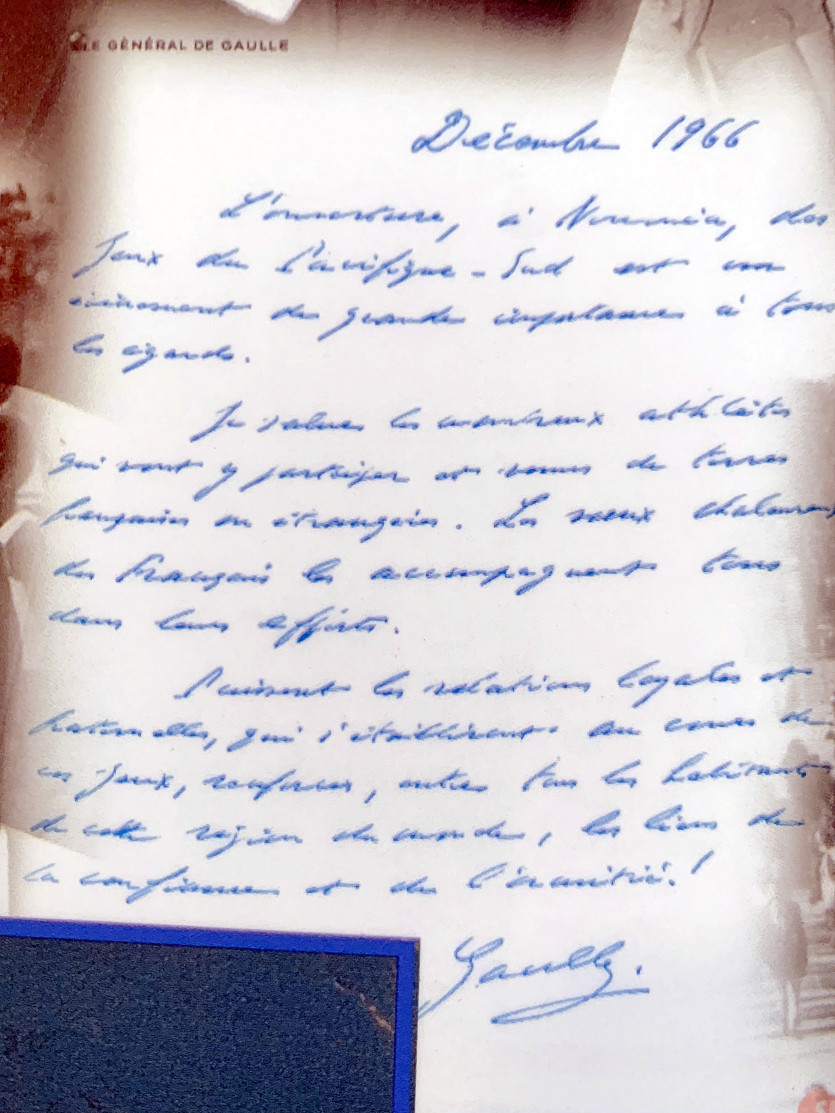 Roger Kaddour, qui était "un grand grand gaulliste", avait été touché par la lettre du général de Gaulle, rencontré l'année précédente, avant l'ouverture des Jeux de 1966. Photo DRIl rédige alors la charte, faisant de lui le père fondateur des Jeux du Pacifique pour bon nombre de personnes.