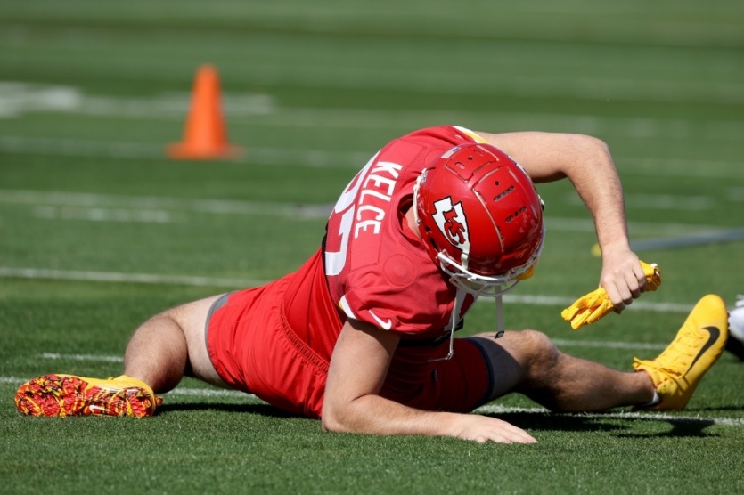Travis Kelce, le tight-end des Kansas City Chiefs, se plie à une séance d'étirements à quelques jours du Super Bowl le 10 février 2013 à Tempe dans l'Arizona Christian Petersen [GETTY IMAGES NORTH AMERICA/AFP/Archives]