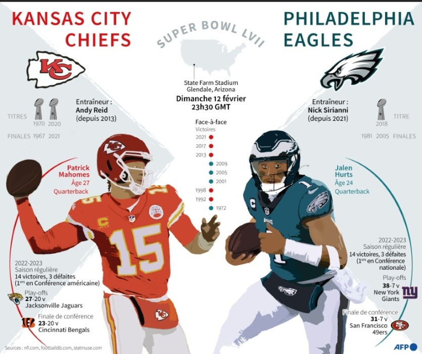 Les Eagles, qui comptent en Hurts un quarterback très performant à la course, peuvent eux se targuer de posséder la défense la plus dissuasive qui soit pour contrecarrer les stratégies de lancers adverses. "Ils ont le plus gros taux de sacks (plaquages) cette saison", n'a pas manqué de relever Mahomes.