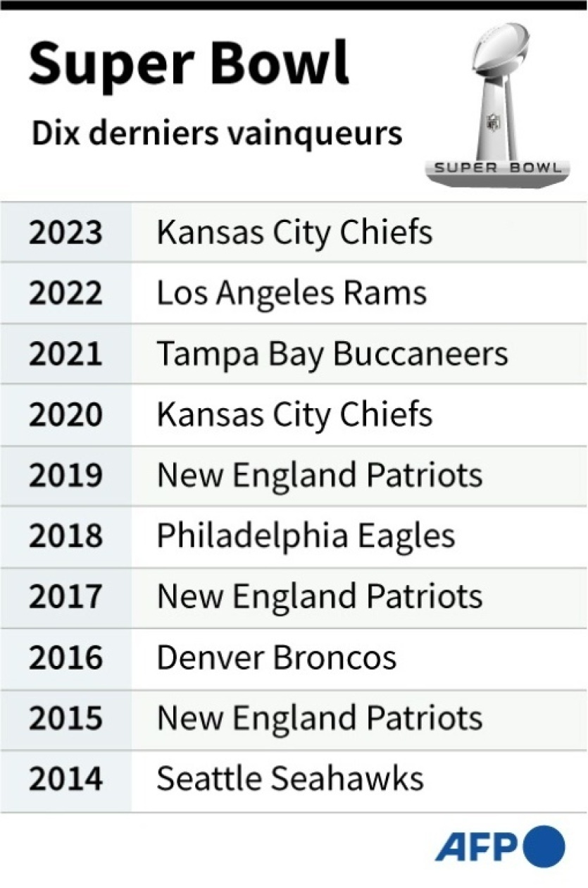 Les dix derniers vainqueurs du Super Bowl, après la 57ème édition remportée par les Kansas City Chiefs [AFP]