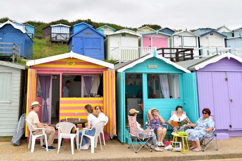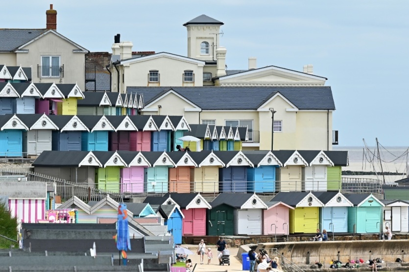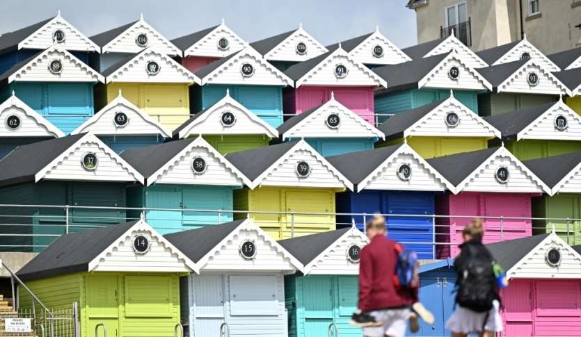 Des personnes assises devant des cabines de plage, le 15 juillet 2021à Walton-on-the-Naze Justin TALLIS [AFP]