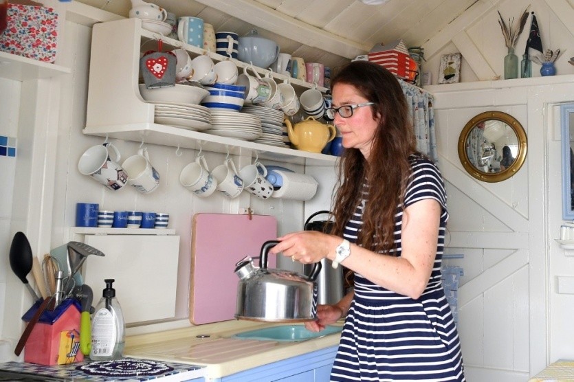 Dans sa mini-maison jaune et blanche, Melanie Whitehead contemple la mer du Nord, une tasse de thé bien chaud à la main. Cette ex-urbaniste n'utilise pas sa cabane dans son but historique -se mettre en maillot de bain à l'abri des regards- mais plutôt pour profiter du cadre tout en étant confortablement installée.