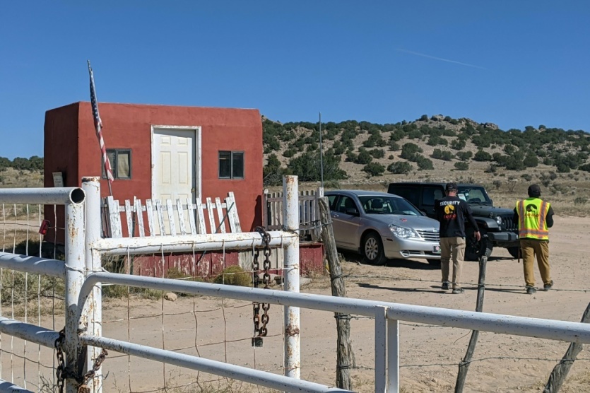 Des gardes à l'entrée du ranch Bonanza Creek le 22 octobre 2021 à Santa Fe, au Nouveau-Mexique, où se déroulait le tournage du film "Rust" lorsqu'a eu lieu le tir mortel qui a tué la directrice de la photographie Anne LEBRETON [AFP]MERCI DE VOUS IDENTIFIER