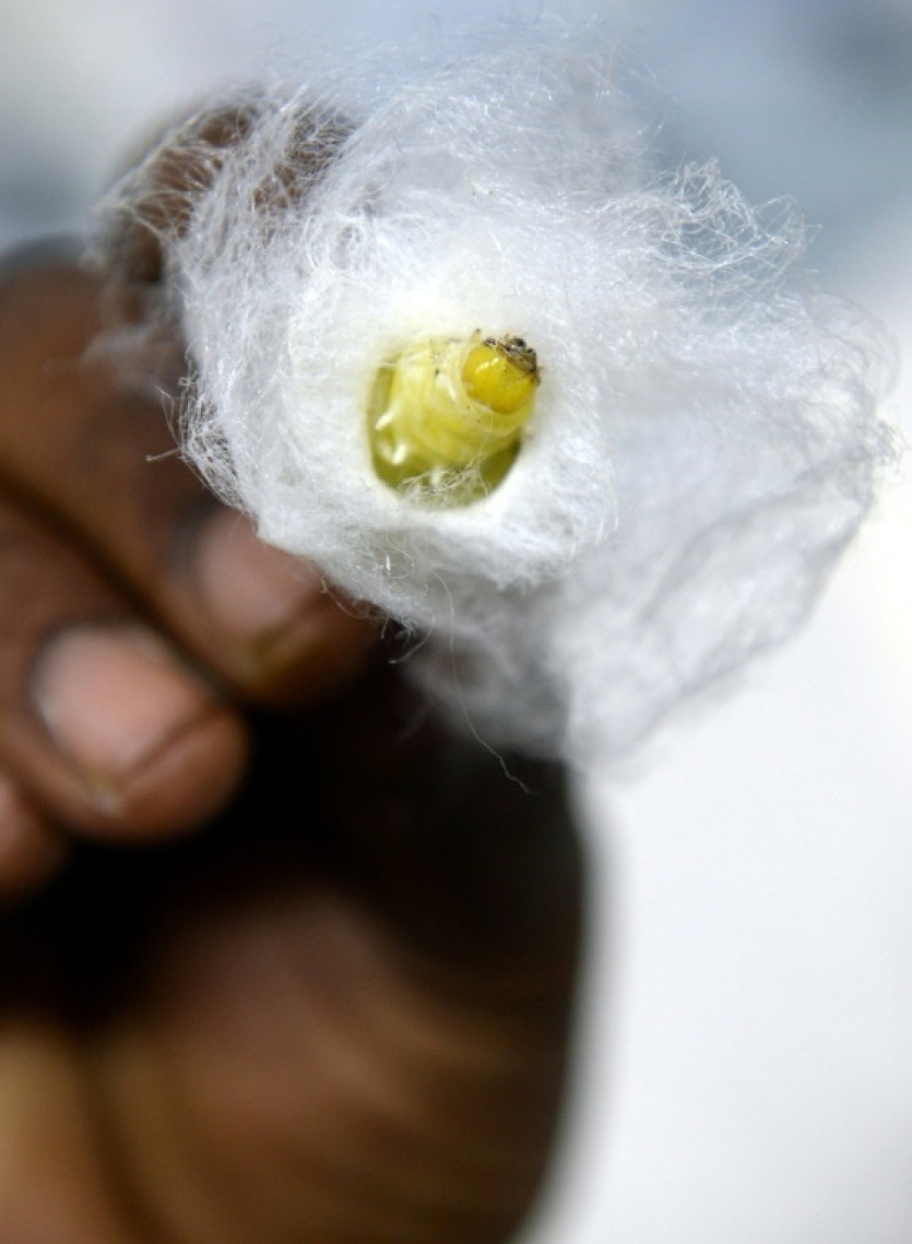 Un ver à soie tisse son cocon lors d'une foire exposition à Chennai, en Inde, le 1er août 2017 ARUN SANKAR [AFP/Archives]MERCI DE VOUS IDENTIFIER
