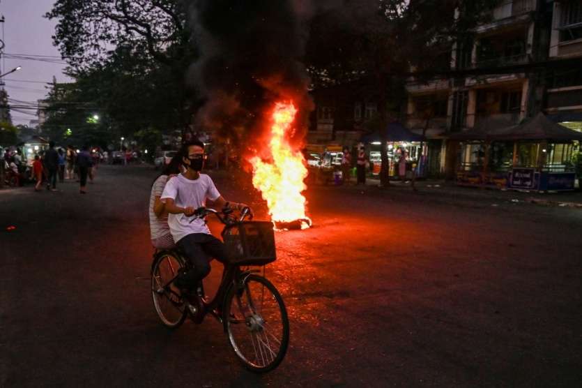 - | Crée le 04.04.2021 à 15h10 | Mis à jour le 04.04.2021 à 16h10ImprimerDes cyclistes passent près d'une barricade en flammes, érigée par des opposants à la junte militaire, le 3 avril 2021 à Rangoun STR [AFP]Le groupe pétrolier français Total a annoncé dimanche qu'il maintenait sa présence controversée en Birmanie, où la répression contre le coup d'Etat militaire a déjà fait des centaines de morts, tout en s'engageant à financer des organisations pour les droits humains dans le pays.