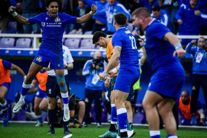 L'ailier italien Ange Capuozzo (G) célèbre la victoire historique de sa sélection à l'issue du test match contre l'Australie, le 12 novembre 2022 à Florence Filippo MONTEFORTE [AFP/Archives]