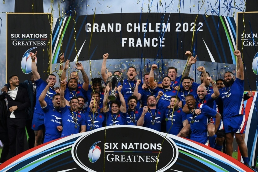 Les Bleus fêtent leur victoire dans l'édition 2022 du tournoi des Six nations, couronné d'un Grand Chelem, le 19 mars 2022 au Stade de France FRANCK FIFE [AFP]MERCI DE VOUS IDENTIFIER