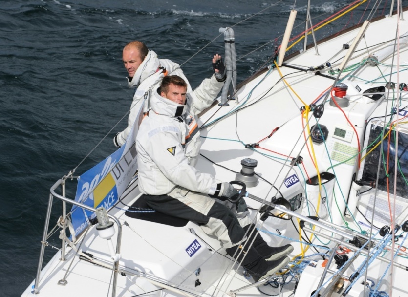 Les skippers français Gilles Favennec (g) et Jean Galfione, à bord de leur monocoque "Nivéa", le 11 avril 2008 au large de Concarneau, neuf jours avant le départ de la AG2R Transat entre Concarneau et l'Ile de Saint-Barthélémy MARCEL MOCHET [AFP/Archives]