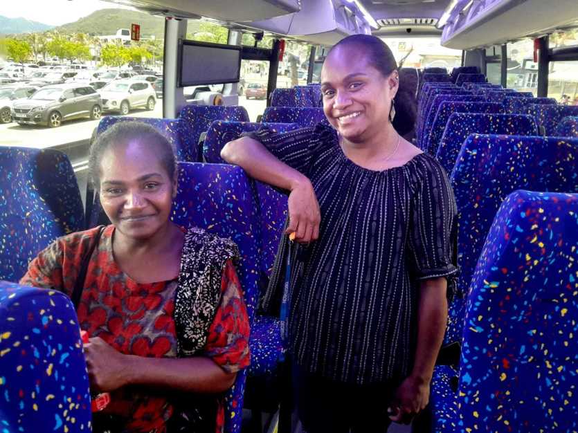 Marianne, originaire de Maré, et Madeleine, originaire de Houaïlou, estiment qu'il était devenu "nécessaire" de renouveller la flotte. Photo Anthony Tejero"Ça a l’air vraiment plus confortable. J’aime les couleurs, cette odeur de neuf quand on rentre, mais dans les cars, il y a beaucoup de dégradations. J’espère que les gens respecteront ces nouveaux cars et qu’ils pourront rester en l’état longtemps. Mais j’en doute…"