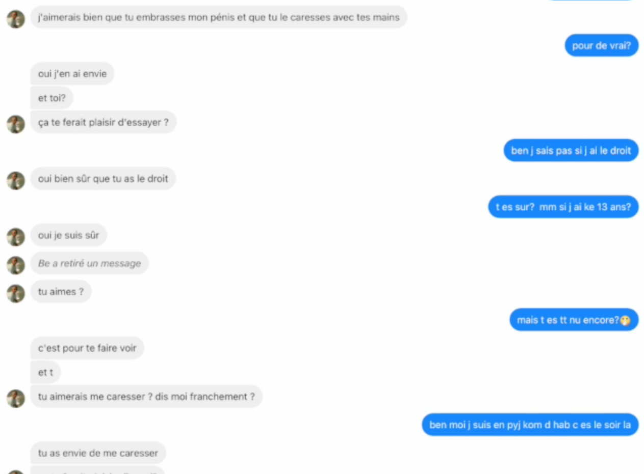 Capture d'écran d'une conversation entre un membre de Truly et un potentiel pédocriminel. Capture d'écran TrulyDepuis la création de l’association, en 2020, le parquet a reçu "une quarantaine de signalements" liés à Truly. Certains ont donné lieu à des condamnations "avec des peines d’emprisonnement ferme conséquentes", selon Yves Dupas.