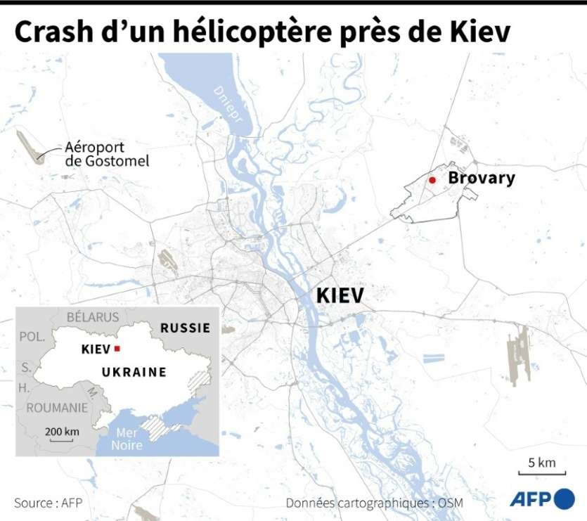 - | Crée le 18.01.2023 à 12h38 | Mis à jour le 19.01.2023 à 18h28ImprimerCrash d'un hélicoptère près de Kiev Sabrina BLANCHARD, Sylvie HUSSON [AFP]Les autorités ukrainiennes démarraient jeudi une enquête criminelle ordonnée par le président Volodymyr Zelensky, après le décès du ministre de l'Intérieur Denys Monastyrsky dans le crash de son hélicoptère qui a fait au moins 14 morts.
