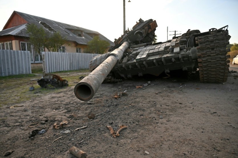 Un char russe détruit près d'Izioum, dans l'est de l'Ukraine, le 7 octobre 2022 SERGEY BOBOK [AFP]MERCI DE VOUS IDENTIFIER
