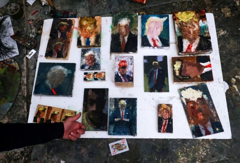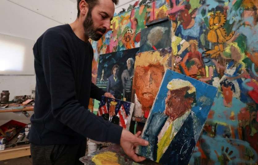 "Avant toute chose, sachez que je ne l'aime pas!", insiste l'artiste volubile, à la barbe fournie et aux yeux noirs perçants dans son atelier de Haïfa (nord d'Israël). On y trouve par dizaines, sur le sol et sur les murs, des portraits de Donald Trump peints sur des toiles ou du bois d'une multitude de formats y compris aussi petits que des photos d'identité.