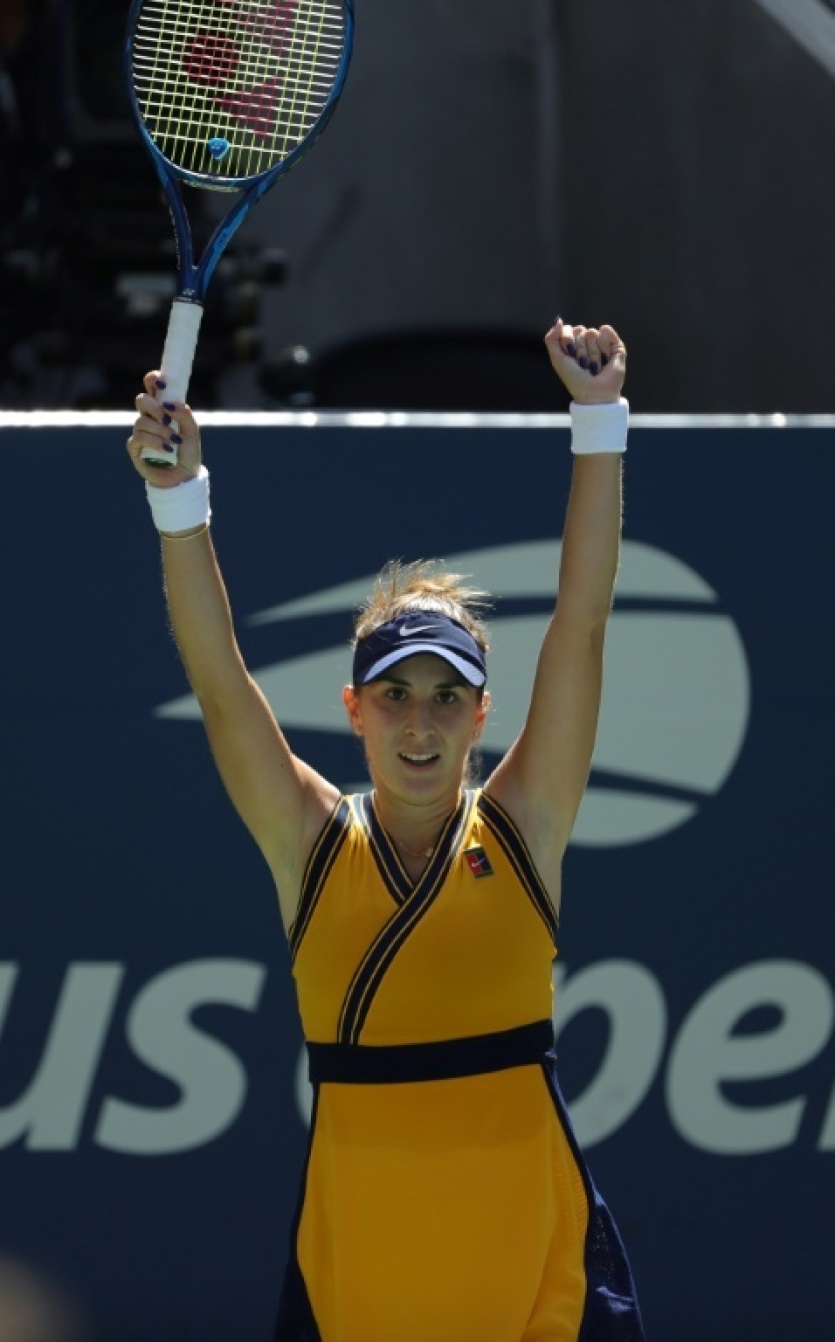 La Suissesse Belinda Bencic après sa victoire face à Iga Swiatek en 8es de finale de l'US Open, le 6 septembre 2021 à New York Kena Betancur [AFP]MERCI DE VOUS IDENTIFIER