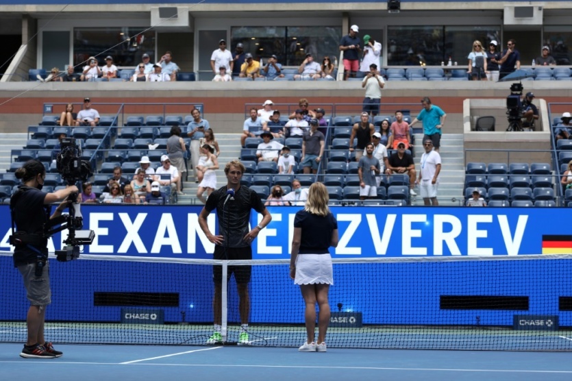 L'Allemand Alexander Zverev est interrogé après sa victoire à l'US Open de tennis face à l'Américain Sam Querrey au Centra national de tennis Billie Jean King à in New York, le 31 août 2021 KENA BETANCUR [AFP]MERCI DE VOUS IDENTIFIER