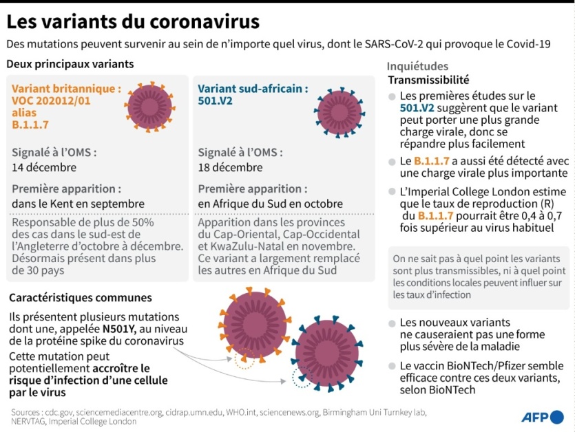 Appelés VOC 202012/01 pour le britannique et 501.V2 pour le sud-africain, ces variants inquiètent la communauté internationale.