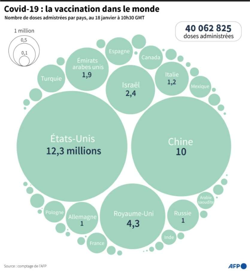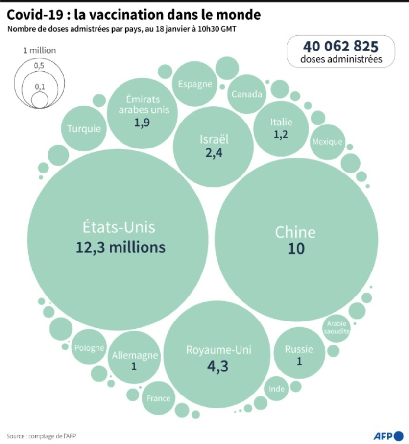 A ce jour, selon un décompte de l'AFP, au moins 60 pays ou territoires, regroupant 61% de la population mondiale, ont lancé leur campagne de vaccination. Mais 11 pays concentrent 90% des doses injectées.