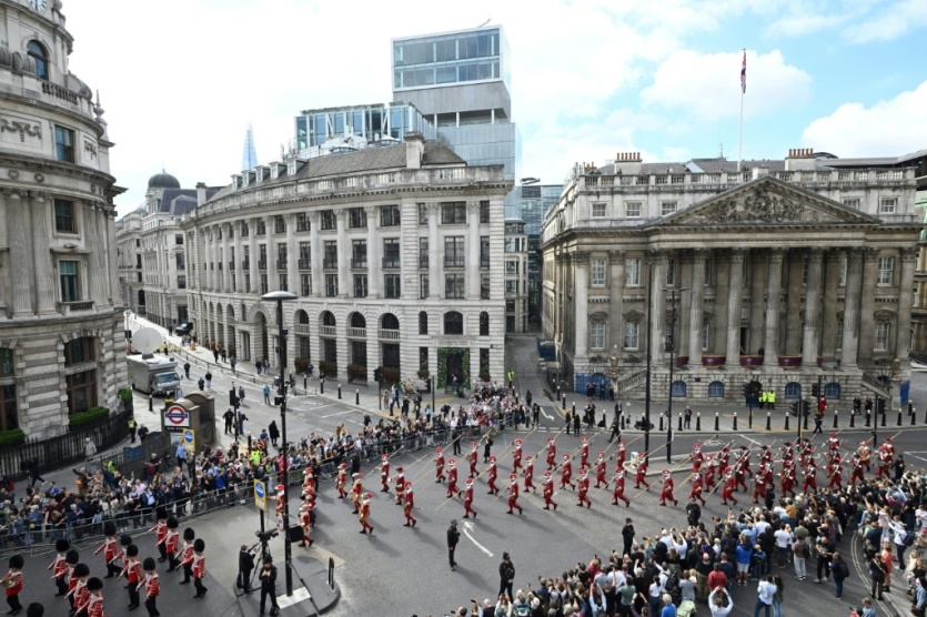 La Compagnie des Piquiers et des Mousquetaires et la Musique de l'Honorable Artillery Company arrivent au Royal Exchange avant la deuxième Proclamation du nouveau Roi Charles III, à Londres, le 10 septembre 2022 Leon Neal [POOL/AFP]