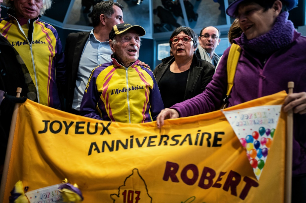 - © 2018 AFP | Crée le 27.11.2018 à 08h44 | Mis à jour le 27.11.2018 à 08h45ImprimerLe cycliste Robert Marchand fête ses 107 ans lors d'une petite balade à vélo en Ardèche le 26 novembre 2018 JEFF PACHOUD-AFP