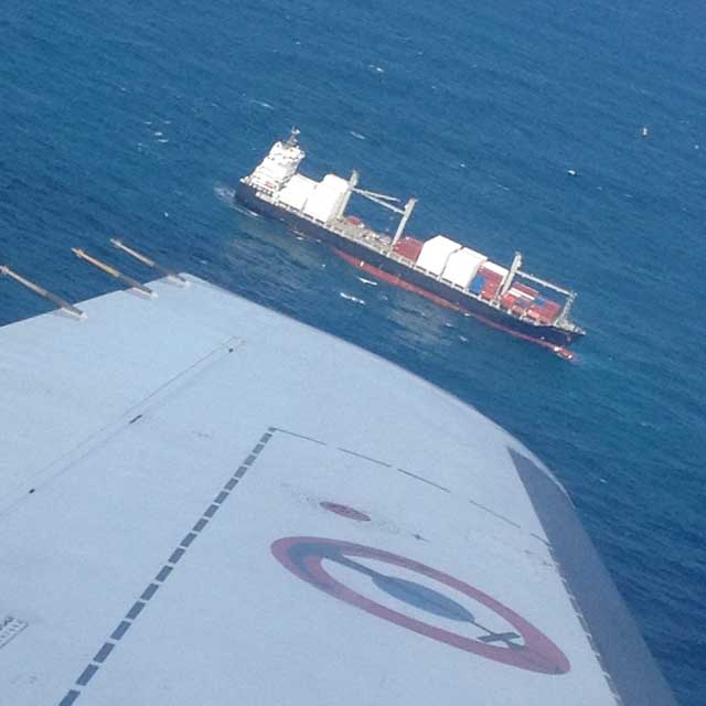 Deux photos prises ce jour, par les Forces armées de Nouvelle-Calédonie, du Kea Trader et de l'hélicoptère géant en action pendant une phase d'extraction d'un conteneur.