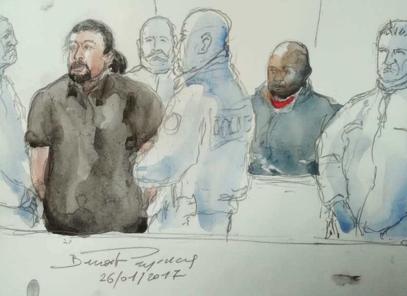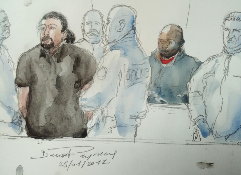 - © 2017 AFP | Crée le 27.01.2017 à 04h40 | Mis à jour le 27.01.2017 à 04h45ImprimerCroquis d'audience du procès de Jawad Bendaoud, le 26 janvier 2017 au tribunal de Bobigny Benoit PEYRUCQ-AFP