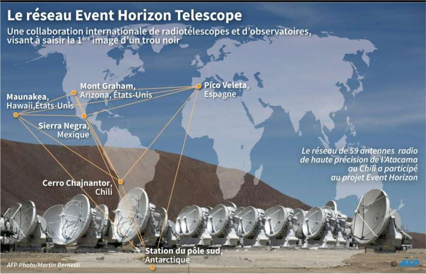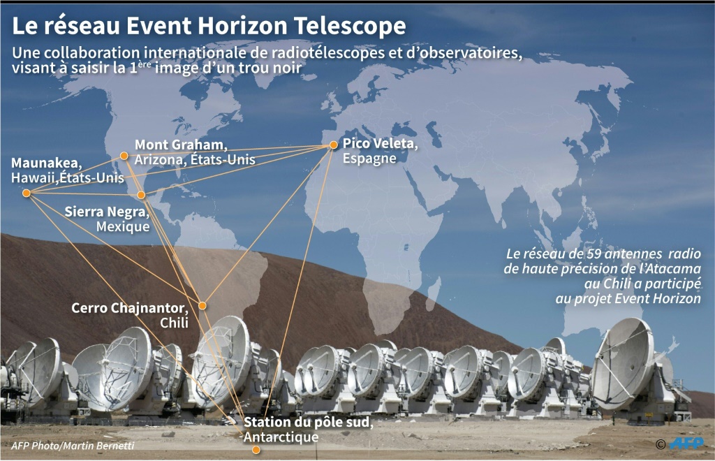 - © 2019 AFP | Crée le 10.04.2019 à 16h30 | Mis à jour le 10.04.2019 à 16h35ImprimerLe réseau Event Horizon Telescope Sophie RAMIS-AFP